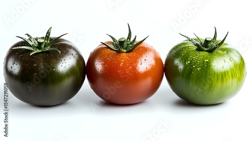 Fresh ripe tomatoes in different colors with water drops on white background - black kumato, red and green zebra heirloom varieties lined up in row.