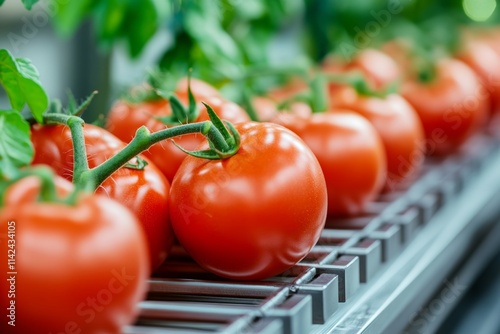 Fresh Ripe Tomatoes on Vine in Greenhouse Setting for Modern Farming Concept
