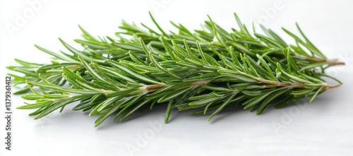 Fresh Rosemary Sprigs on White Background Top Down View of Green Herbal Twig Collection