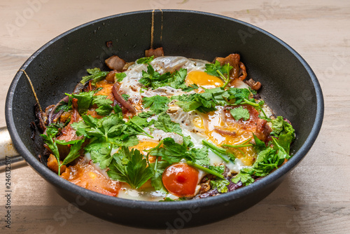 Fresh rustic breakfast - fried egg with bacon, onion and cherry tomatoes in a pan