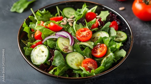 Fresh salad bowl featuring mixed greens and cherry tomatoes with cucumber slices and sunflower seeds served in a rustic bowl