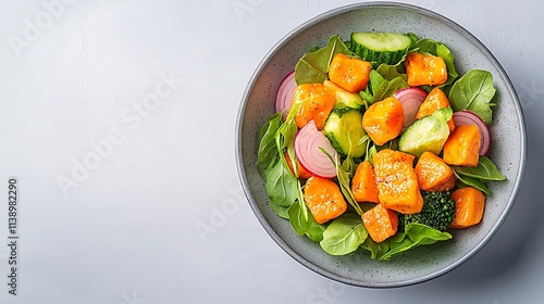 Fresh salad bowl with broccoli and cucumbers healthy meal minimalist setting top view