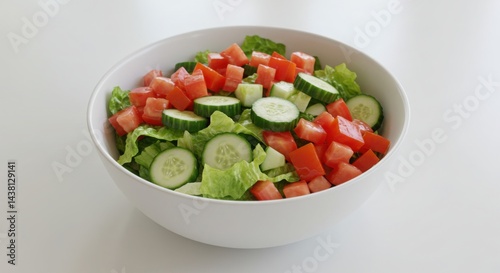 Fresh salad bowl with various vegetables presented neatly on a clean table.