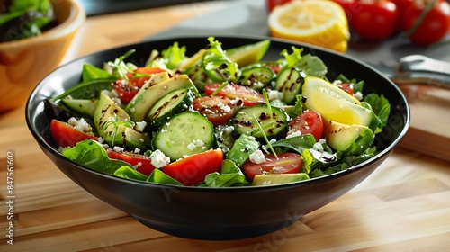 fresh salad in black bowl. variety of greens, including lettuce and spinach, as well as colorful vegetables such as cherry tomatoes, cucumber slices, and what appears to be some yellow bell pepper pie