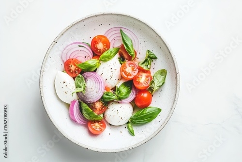 Fresh salad of mozzarella, cherry tomatoes, red onion, and basil in a white bowl