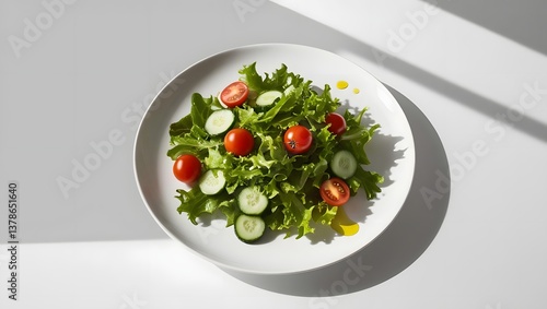 Fresh Salad on a White Plate with Tomatoes, Cucumbers, and Greens