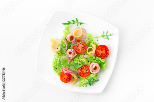 Fresh salad with tomatoes, arugula, cheese and ham on the white plate and white background