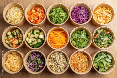 Fresh Salads Presented in Round Compostable Bowls on a Wooden Surface at a Casual Dining Setting
