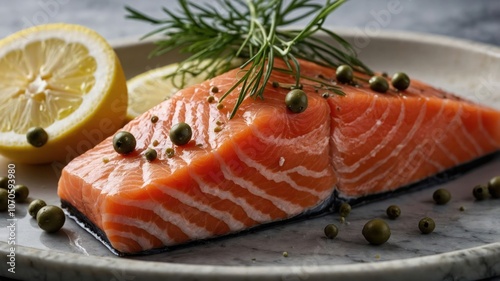 Fresh salmon fillet garnished with lemon and herbs on a plate.