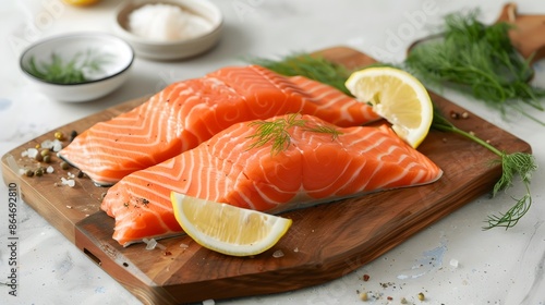 Fresh Salmon Fillet on Wooden Board with Lemon and Herb Garnish