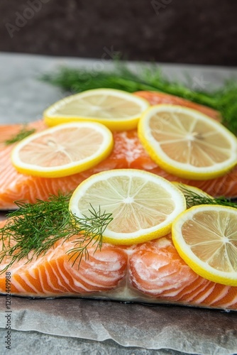 Fresh salmon fillets garnished with lemon slices and dill on par