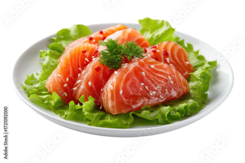 Fresh salmon sashimi on lettuce garnished with dill and sesame seeds, cut out