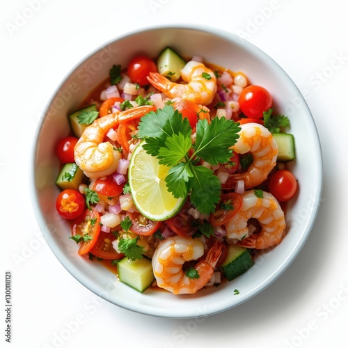 Fresh seafood ceviche with lime, cilantro, tomatoes, cucumber, onion in white bowl. Shrimp, raw fish salad. Peruvian, Latin American cookery. Healthy, tasty, delicious meal. Gourmet food dish,