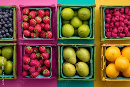 Fresh seasonal fruits displayed in colorful crates on a vibrant background at a local farmers market