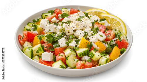 Fresh Shopska Salad with Cucumbers, Tomatoes, Peppers, and Feta Cheese Garnished with Lemon Slices
