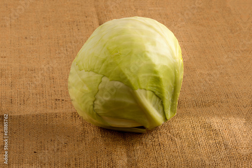 fresh single cabbage on burlap