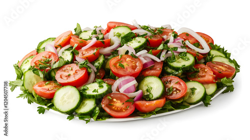 Fresh Sliced Onion, Cucumber, and Tomato on White Background