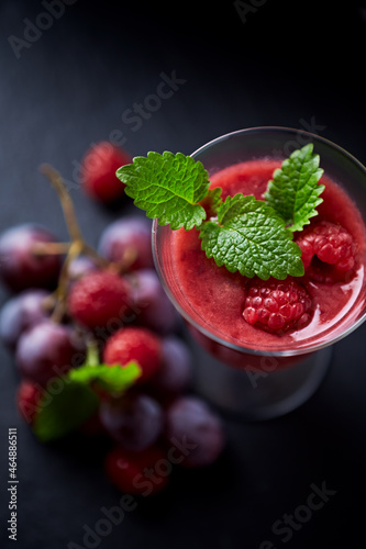 Fresh smoothie in a glass. Dark background. Close up.