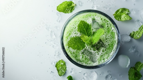 Fresh smoothie splash with mint leaves on white surface, emphasizing refreshment and wellness