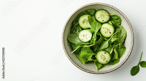 Fresh spinach and cucumber salad in a rustic bowl on white surface