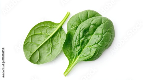Fresh spinach leaves, cut into halves, displaying the vibrant green color and crisp texture. Isolated on a pristine white background