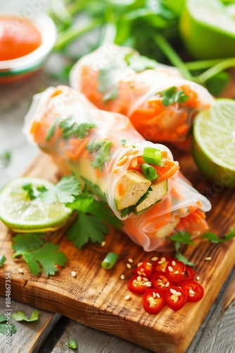 fresh spring rolls filled with tofu, vegetables, and herbs, placed on a wooden cutting board with lime slices, cilantro, and dipping sauce