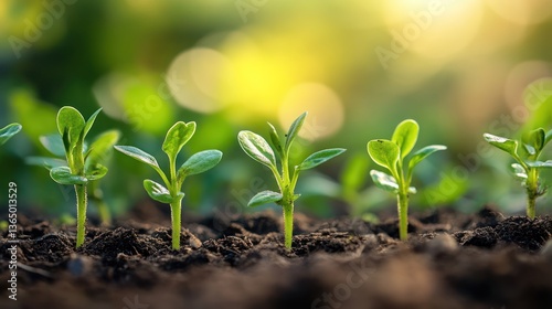 Fresh sprouts emerging from soil, sunlit, nature scene