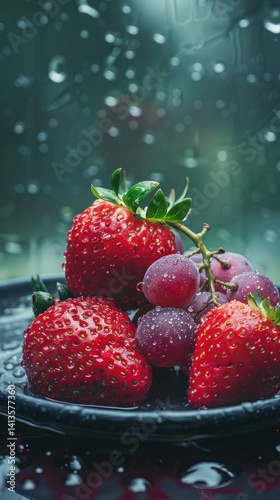Fresh strawberries and grapes on a dark plate, rainy window background