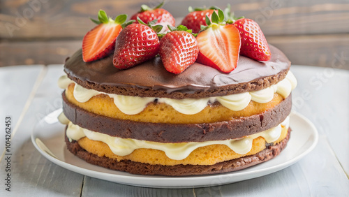 Fresh strawberries are a perfect complement to a beautiful homemade cake on a plate.