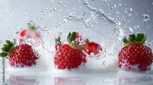 Fresh strawberries splashing into creamy milk or yoghurt on a white background