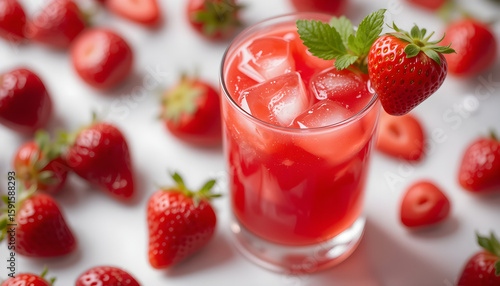 Fresh strawberry juice in a tall glass, vibrant red with visible strawberry seeds and ice cubes, on a white background