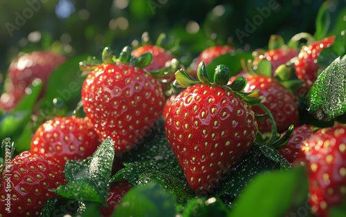 Fresh strawberry surface in high detail, visible seeds and juicy texture