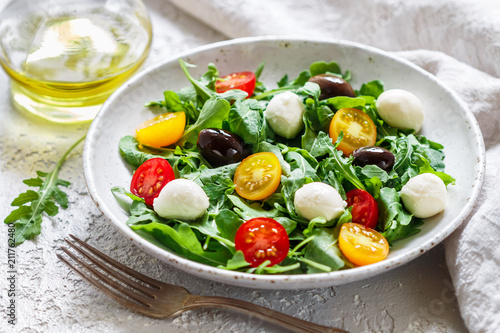 Fresh summer salad with arugula, yellow and red cherry tomatoes, Kalamata olives and mozzarella