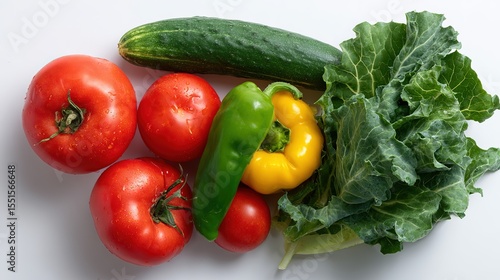 Fresh summer vegetables: tomatoes, cucumber, peppers, and greens. A vibrant display of seasonal produce.