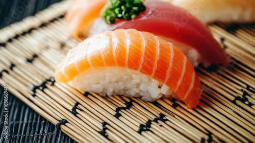 Fresh sushi pieces served on bamboo mat in elegant presentation
