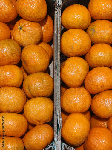 Fresh tangerines are neatly packed in cardboard boxes on store counter. Healthy and vitamin-rich citrus fruits. Healthy eating, vegetarian. European Farmer Markets. Top view.