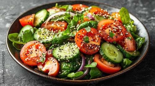 Fresh tomato, cucumber, and spinach salad with sesame seeds on a dark plate.