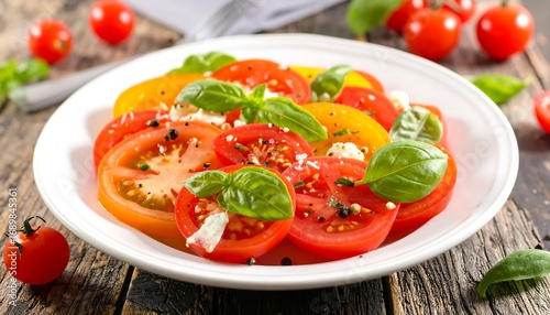 Fresh tomato salad on a white plate, featuring colorful sliced tomatoes, basil leaves, pepper, and cheese, set against a rustic wood background