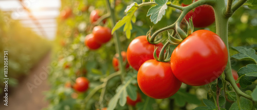 Fresh tomatoes growing in greenhouse, showcasing vibrant red color and lush green foliage, symbolizing healthy agriculture and nature bounty