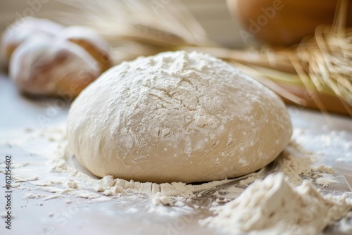 Fresh, unbaked dough rests on a floured surface, ready for shaping and baking, with wheat stalks in the background