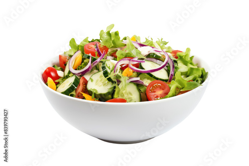 Fresh vegetable salad with lettuce, tomatoes, cucumbers, and onions in a white bowl. Perfect for a healthy meal or diet concept.