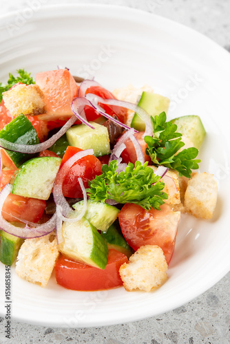 Fresh vegetable salad with tomatoes, cucumbers, red onions, parsley, croutons, and olives in white bowl on a speckled gray surface. vibrant colors and healthy ingredients make it appealing photography