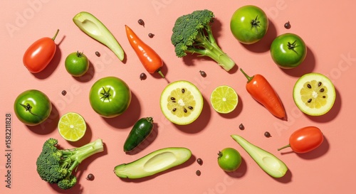 Fresh vegetables and fruits arranged in colorful layout on pink background