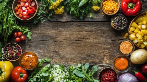Fresh vegetables and spices arranged on rustic wood. Perfect for cooking, recipe blogs, or healthy eating concepts.