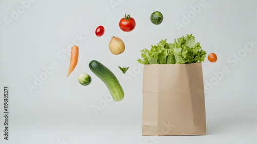 Fresh Vegetables Falling into a Paper Bag, grocery shopping, healthy food, fresh produce, levitating vegetables, flying vegetables