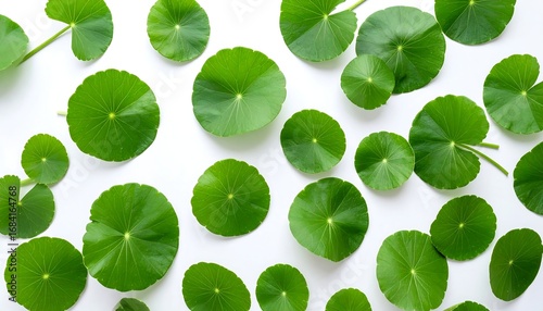 Fresh, vibrant green leaves arranged on a white background in a circular pattern. Atop, a flat, detailed, and symmetrical view