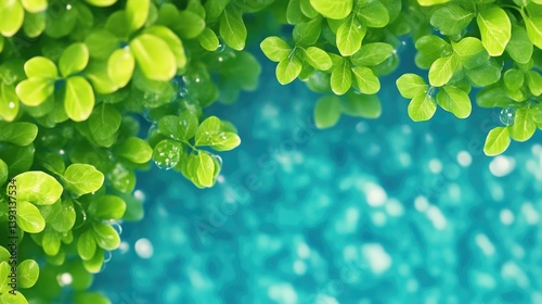 Fresh, vibrant greenery cascading over a teal surface. Delicate leaves and water droplets create a serene, natural background