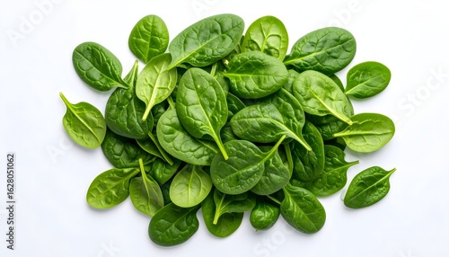 Fresh vibrant spinach leaves neatly arranged on a clean white background.