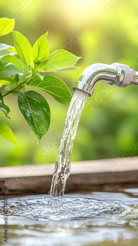 Fresh water flowing from a tap into a wooden basin, surrounded by lush green foliage . AI generative
