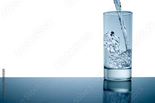 Fresh water poured into a glass with copyspace, isolated and blue toned